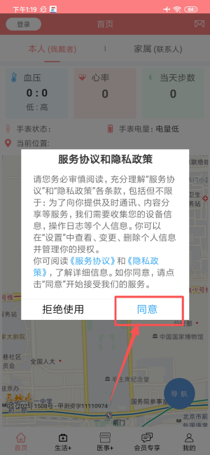 1、在服務(wù)協(xié)議彈窗中點(diǎn)擊"同意",進(jìn)入首頁查看健康信息。