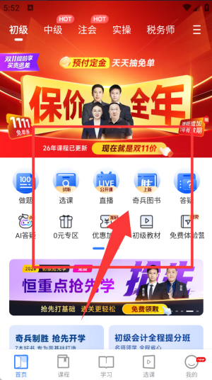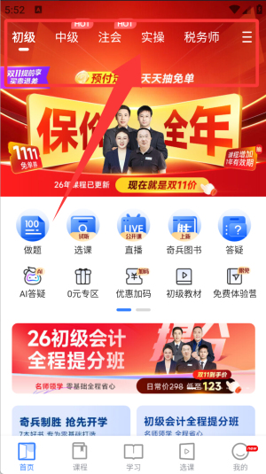 1、打開(kāi)軟件后先完成注冊(cè)登錄,進(jìn)入主頁(yè)選擇適合自己備考階段的課程類別。