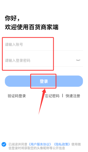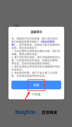 1、在百貨商家端中點擊"同意"溫馨提示,進入引導(dǎo)頁面。