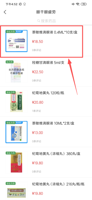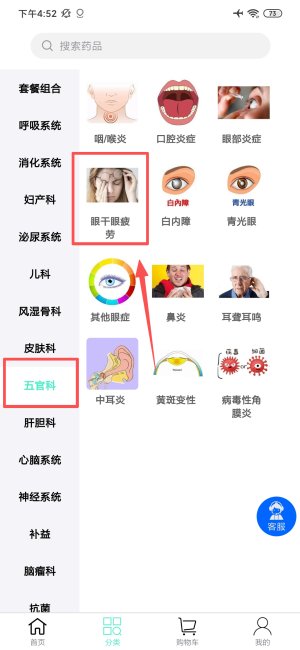 2、選擇五官科分類的眼干眼疲勞選項(xiàng),進(jìn)入藥品列表。