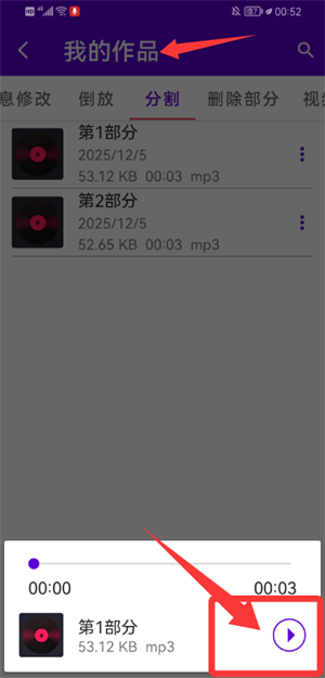 3、完成后在我的作品頁,可點(diǎn)擊片段進(jìn)行試聽。