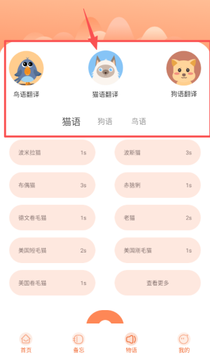 2、在動(dòng)物語(yǔ)言庫(kù)中可以點(diǎn)按播放不同情緒的鳥(niǎo)叫、貓叫或狗叫,比如開(kāi)心、害怕、饑餓等聲音,用來(lái)和自家寵物互動(dòng)試試看效果。