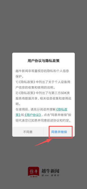 1、在越牛新聞中點擊"同意并繼續(xù)",進入功能引導頁面。