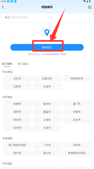 1、點(diǎn)擊自動(dòng)定位按鈕,獲取并顯示所在城市。