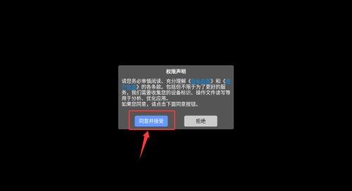 1、在權(quán)限聲明窗口點(diǎn)擊"同意并接受",即可進(jìn)入應(yīng)用。