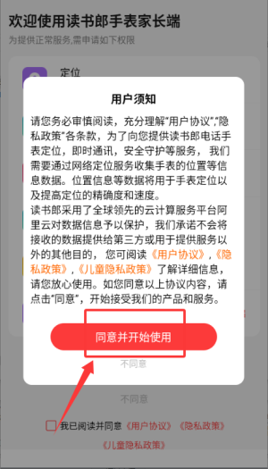 1、在讀書郎手表家長(zhǎng)端勾選協(xié)議并點(diǎn)擊"同意并開始使用"。