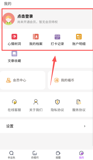 1、切換至我的頁面完成登錄,即可使用心情樹洞及個人檔案功能。