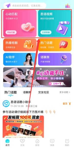 3、首頁(yè)提供心動(dòng)匹配交友服務(wù)與思語(yǔ)短視頻內(nèi)容瀏覽與互動(dòng)功能。