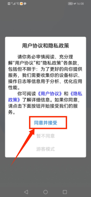 1、首次啟動應用,請在用戶協(xié)議彈窗點擊同意并接受。
