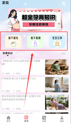 3、發(fā)現(xiàn)頁面集成三大實用工具板塊,涵蓋飲食安全查詢系統(tǒng)、孕期行為規(guī)范指南以及嬰幼兒成長發(fā)育全程記錄功能。